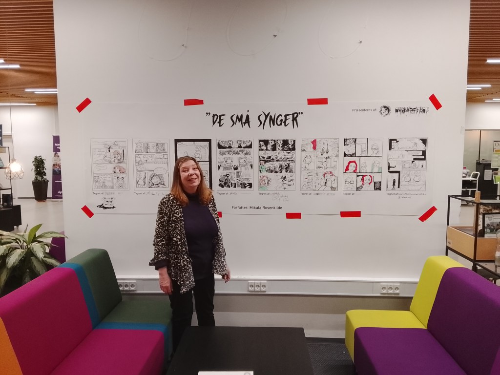 Mikala Rosenkilde foran årets tegneserievæg på Skrækfest, som byggede på hendes novelle ‘De små synger’.