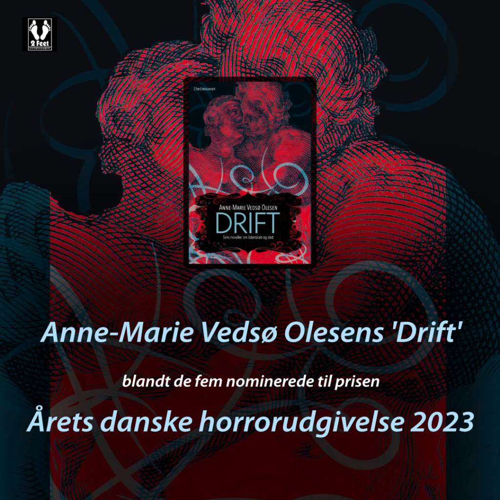 Shortlisten med de fem nominerede til prisen Årets Danske Horrorudgivelse 2023 er netop kommet, og i år er der hele to bøger her fra 2 Feet Entertainment på listen. Det er første gang nogensinde, at vi har to titler blandt de nominerede, og i øvrigt tredje år i træk, at bøger herfra optræder på listen.